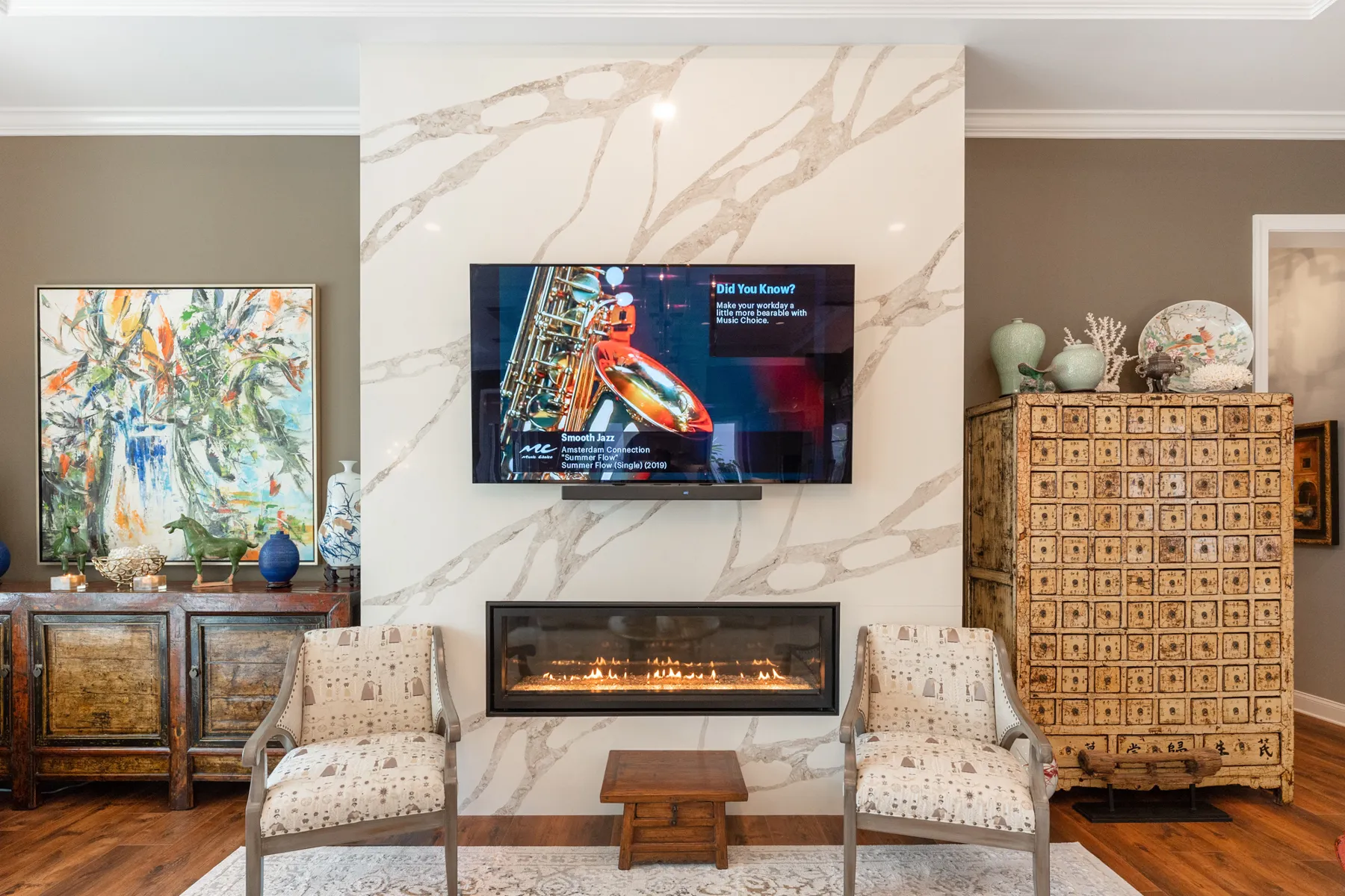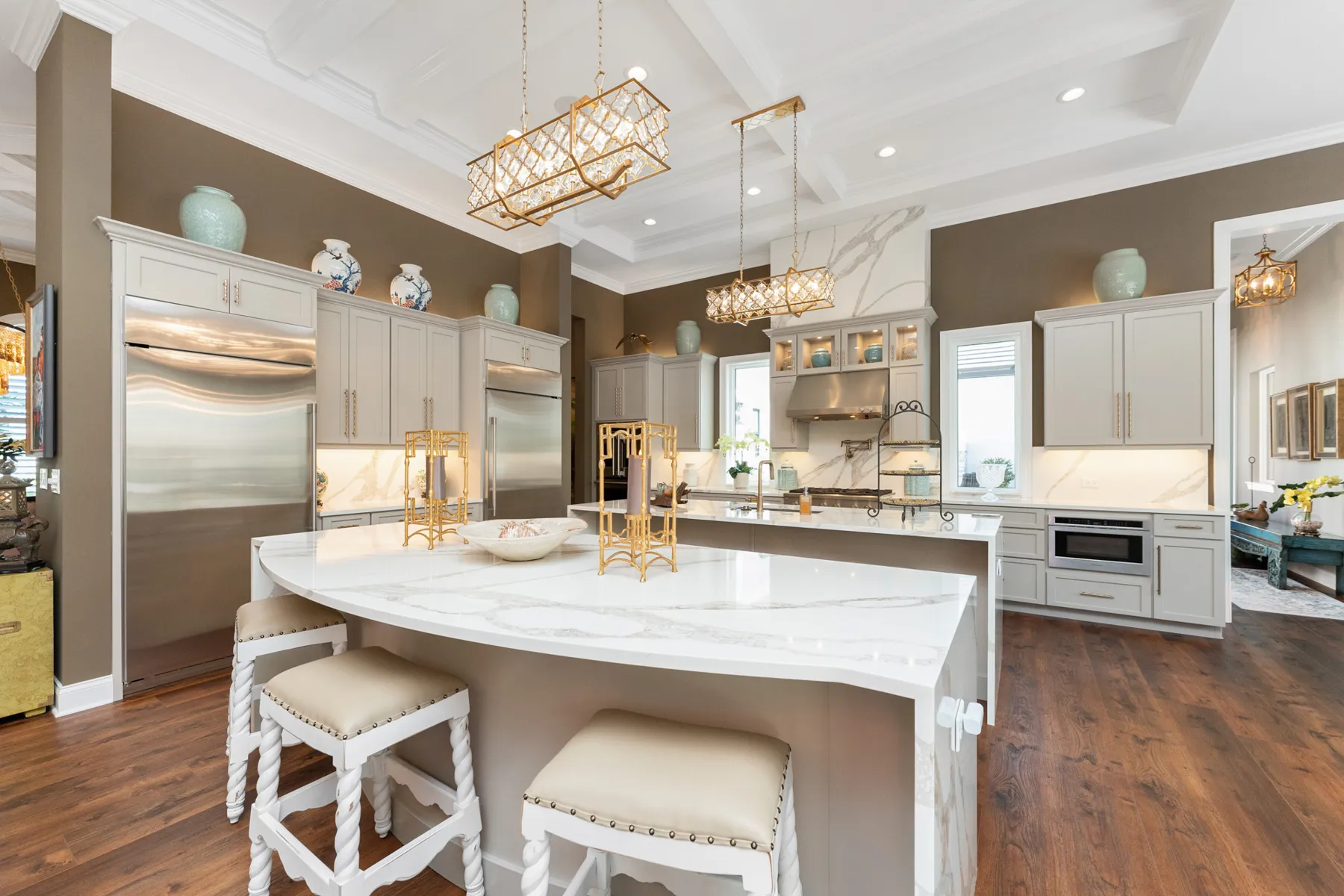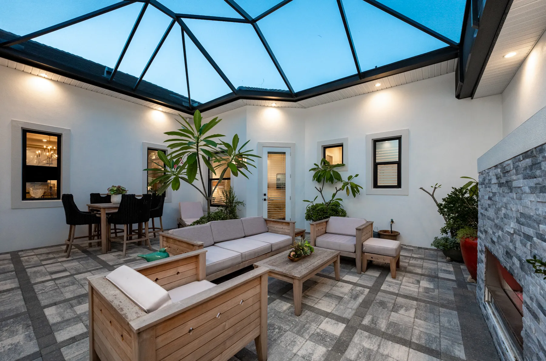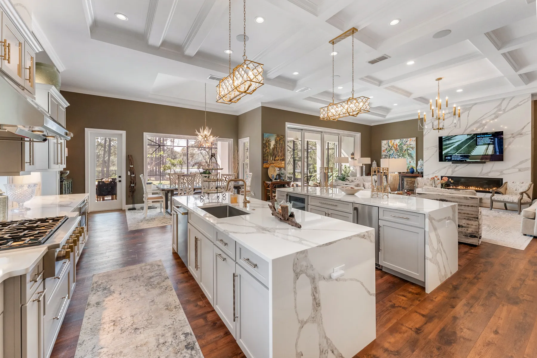 Inside, soaring ceilings and natural light highlight the home’s open-concept layout. The great room blends sophisticated finishes with comfortable design, anchored by a striking fireplace wall and expansive glass doors that seamlessly connect indoor and outdoor living. The gourmet kitchen includes custom cabinetry, professional-grade appliances, and luxe stone countertops — a true centerpiece for gatherings.